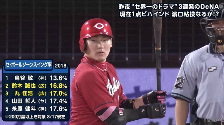 ボールの見極め◎ 出塁率王・広島丸の選球眼を分析 ボールスイング率もリーグ3位の低さ 2019/10/24 20:50 拡大する 8月18日に行われた横浜DeNA対広島17回戦、Abema TVの生中継において、広島・丸佳浩外野手(29)の選球眼の良さが現れているデータが公開された。 「セ・ボールゾーンスイング率」では 1位に13.6%で鳥谷(阪神)、2位に16.8%の鈴木(広島)、3位に同じく広島の丸が17.0%、4位に山田(ヤクルト)が17.4%、5位に糸原が(阪神)17.6%がランクイン。また「出塁率ランキング」では1位、2位を広島が独占。1位の丸が.484、2位は鈴木が.450と、チャンスメイクもしくは得点につながる仕事ができていることを示している。3位に.434の山田(ヤクルト)、4位に.4176で平田(中日)、4位と1毛差の5位に.4175の坂本(巨人)が続いた。(データスタジアム調べ、8月17日現在) 続きを読む