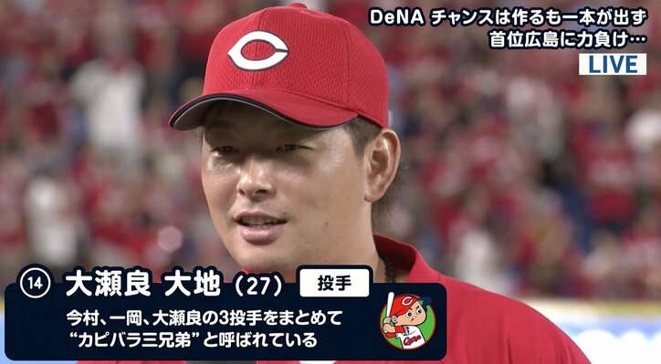 広島大瀬良がハーラートップ13勝目 チームもマジック「30」再点灯「1つ1つ減らしていければ」 2019/10/24 20:50 拡大する 8月18日に行われた横浜DeNA対広島の17回戦は、広島先発の大瀬良大地投手(27)が7回を1失点に抑え、ハーラー単独トップを走る13勝目を挙げた。2回に1点を失ったものの、その後はエースらしい投球で打線の援護を呼び込んだ。チームはマジック30が再点灯。「1つ1つやっていきたい」と落ち着いた口調で答えた。インタビューの内容は以下のとおり。-今日も素晴らしいピッチングでした。振り返っていかがですか。 続きを読む