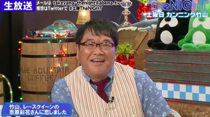 ほぼストーカー!?カンニング竹山が今、恋している女性 2019/03/15 09:37 拡大する 25日深夜、『カンニング竹山の土曜The NIGHT』(AbemaTV)が放送された。 単独ライブ『放送禁止 2018』の本番が近づく中、竹山は稽古場でスマホを延々といじることがあるそうで「1人の子に恋した事件がおきまして(笑)」と、Instagram閲覧中に“思い人”を見つけてしまったと告白する。 「メチャクチャかわいいんですよ!」と興奮気味に話す竹山。名前を調べたところ、レースクイーンの市原彩花だったことが判明したという。竹山は「もし、まかり間違って市原さんがこれ(『土曜The NIGHT』)を見ていたら、電話くれないかな?」と下心全開で訴えた。 続きを読む