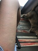 桃は「足に全体(太もも)が3日前くらいから蕁麻疹みたいなかんじで凸凹に…」と症状を説明し、患部の写真を公開。写真では、太もも全体に、ミミズ腫れのようなものが出ていおり痛々しい印象だ。