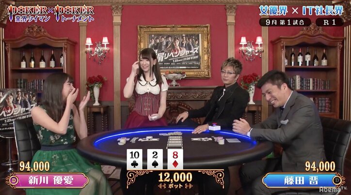 女優・新川優愛もIT社長・藤田晋もまさかのゲラ GACKTのトークに笑いまくりでペナルティ連発 2019/03/15 09:37 拡大する アーティスト・GACKTがオーナーを務めるAbemaTV「GACKTプロデュース!POKER×POKER~業界タイマントーナメント」。9月7日放送回では、そのGACKTのトークがいつも以上に冴え渡った。 この日の組み合わせは、女優界代表・新川優愛とIT社長界代表・藤田晋の対決。試合開始前、新川は「(女優は)いろいろな表情を出す仕事なので、逆に表情を出さないポーカーフェイスでいければ」とコメント。藤田は言わずと知れたAbemaTVのボスであり、さぞかし緊張感のあるクールな試合展開になるかと思われたが、それは大きな間違い、なんと2人とも超が付くほどのゲラ(笑い上戸)だったのだ。 続きを読む
