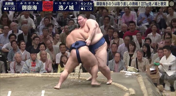 御嶽海、227kgの巨漢・逸ノ城を「パワー」で制する! 圧巻の4連勝 2019/10/24 20:50 拡大する <大相撲秋場所>◇四日目◇12日◇東京・両国国技館 2場所連続優勝を狙う関脇の御嶽海(出羽海)が、同じく関脇の逸ノ城(湊)を押し出しで下して4連勝を飾った。 立ち合い低く当たった御嶽海は、頭をつけ、下から下から、右からのハズ押しで逸ノ城を土俵際に押し込むと、一気の押し出しで勝負をつけた。 予想外の展開に館内は割れんばかりの大歓声に沸いた。一方、AbemaTVにゲストで登場したお笑いタレントの厚切りジェイソンが「座布団は投げないんですね」と話すと、元前頭・大碇の甲山親方は「まだ取組は残っていますからね」と冷静に応じていた。 続きを読む