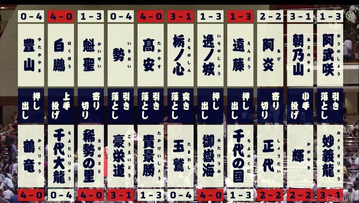 「3横綱が初日から4連勝」は平成元年3月以来29年ぶり 大相撲秋場所、本命力士が“順当”で優勝争いは“混迷” 2019/10/24 20:50 拡大する 大相撲秋場所四日目は、全取組を終え、幕内の全勝力士は6人となった。 2場所連続優勝を狙う関脇・御嶽海(出羽海)は強敵・関脇の逸ノ城(湊)を押し出しで、さらに大関・高安(田子ノ浦)は小結・貴景勝(貴乃花)を引き落としで下して4勝目。 なお稀勢の里(田子ノ浦)、白鵬(宮城野)、鶴竜(井筒)の3横綱は揃って勝って初日から4連勝。「3横綱が初日から4連勝」は平成元年3月以来、実に29年ぶりの出来事となった。 続きを読む