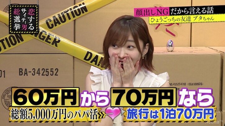 25歳女性が語る、総額5000万円を貢がせる「パパ活」の実情 指原莉乃&ブラマヨの恋するサイテー男総選挙 2019/03/15 09:37 拡大する HKT48の指原莉乃と、ブラックマヨネーズの小杉竜一、吉田敬がMCを務める『指原莉乃&ブラマヨの恋するサイテー男総選挙』♯70(毎週火曜よる9時~)が9月18日(火)、AbemaTV(アベマTV)にて放送。“パパ活”の実情にMCの3人が驚愕する一幕がある。 同番組は、女性が幸せな恋愛をするために、ゆがんだ恋愛観を持つサイテー男たちから極悪非道なエピソードを聞き出すトークバラエティ番組。今回は「顔出しNGの友達SP」と題し、サイテー男たちの友人たちが顔を隠してスタジオに集結。顔出しナシだからこそ話せる過激なトークを展開する。 続きを読む