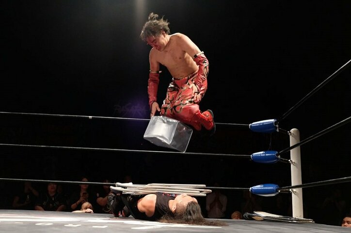 皮膚よりも骨!デスマッチを超えろ! 木高イサミVS竹田誠志、ハードコアケージマッチ開催 2019/10/24 23:25 拡大する (一斗缶ごとニードロップを投下するイサミ。ハードコアの痛みは皮膚よりも骨にくるイメージだ)DDTグループの団体、プロレスリングBASARAが9月21日に後楽園ホール大会を開催する。ここで代表を務める木高イサミが、勝負カードを切ってきた。竹田誠志とのシングルマッチである。イサミと竹田は若手時代から意識しあってきた、盟友にしてライバル。デスマッチ戦線でシノギを削り、先に大日本プロレスのデスマッチヘビー級王座を獲得したのはイサミだった。だが竹田は昨年、同王座初戴冠を果たすと現在まで長期政権を築いている。 続きを読む