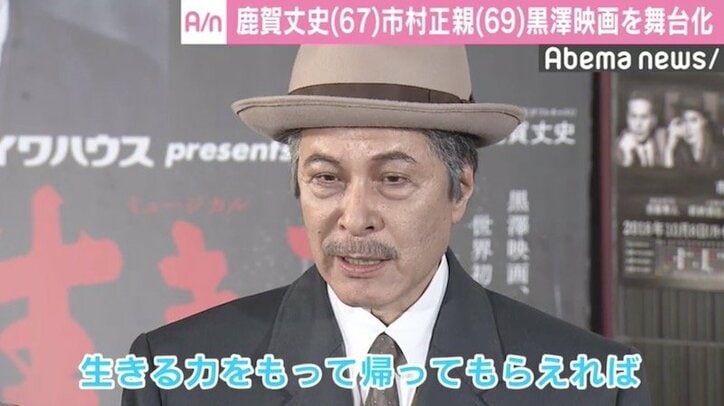 鹿賀丈史、黒澤監督映画ミュージカルで「生きる力を持って帰って」 2018/10/08 07:20 拡大する 俳優の鹿賀丈史(67)と市村正親(69)がダブルキャストで主演を務めるミュージカル『生きる』の公開舞台稽古が、7日に都内で行われた。 同ミュージカルは、1952年に公開された黒澤明監督の映画『生きる』が原作のミュージカルで、がんで余命わずかと宣告された男の生き様を描いた物語。 黒澤監督作品のミュージカル化で作品の演出を手掛けた宮本亜門(60)は、大きなプレッシャーを感じながらも仕上がりに満足しているようで、「黒澤監督も、天国で『おっ』と喜んでくれていると思いますよ。ちょっと超えているところもあるかなと。全部とは言いません」と自信満々に語った。 続きを読む
