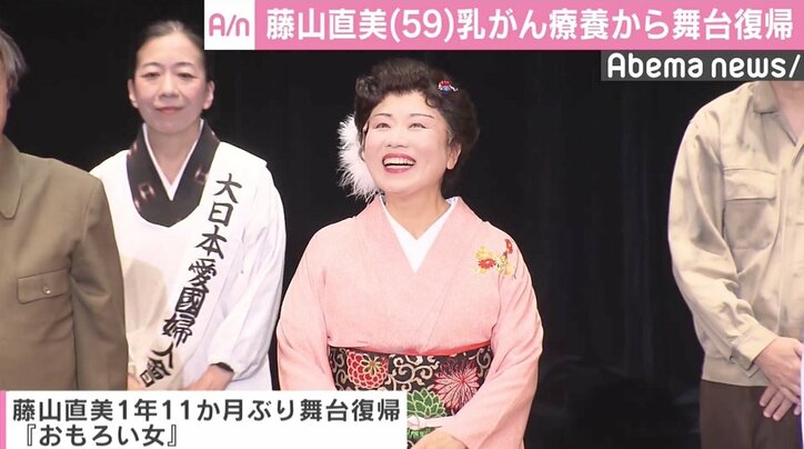 藤山直美、乳がん療養後約2年ぶり復帰 大ファンの矢沢永吉に「三途の川で後悔すると思って…」 2018/10/09 09:13 拡大する 初期の乳がんで療養していた女優の藤山直美(59)が8日、舞台『おもろい女』で約2年ぶりに舞台復帰した。 舞台『おもろい女』は、藤山演じる、昭和初期の天才漫才師ミス・ワカナの半生を描いた喜劇。生前の森光子さん(92)の代表作としても知られる人気作だ。2015年に藤山が主演を受け継ぎ、その後も再演が予定されていたが、2017年、藤山の乳がん治療のため延期となっていた。 昨年2月に初期の乳がんを公表し、手術と療養をしていた藤山。駆けつけた取材陣に「同じ役を2回させていただけるということだけでも役者冥利に尽きる」と意気込みを語った。 続きを読む