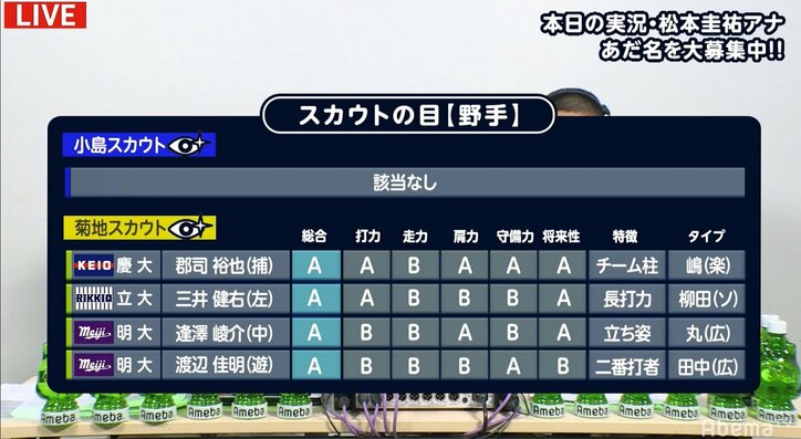 「今の六大学にはワクワクする打者がいない」 元MLBスカウト・小島氏が胸の内を明かす 2019/10/24 20:50 拡大する 元ロサンゼルス・ドジャースの日本担当スカウトとして斎藤隆氏や黒田博樹氏の獲得にも関わり、現在はアリゾナ・ダイヤモンドバックスの顧問を務める小島圭市氏(50)が「現在の六大学野球には気になる打者がいない」と本音を明かした。 10月8日にAbemaTVで放送された東京六大学野球秋季リーグの中継に解説として登場した小島氏は、現在の六大学で活躍する投手と野手におけるスカウト目線での評価に言及。投手部門では明治大学の森下暢仁、早稲田大学の早川隆久、法政大学の三浦銀二ら3人を評価した一方、野手に関しては評価対象として「該当なし」と答えた。 続きを読む