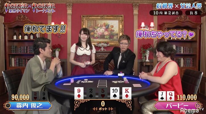 将棋・森内俊之九段、芸人・バービーとの頭脳戦に「痺れてます」 2019/03/15 09:37 拡大する 永世名人の資格を持つ将棋の森内俊之九段が10月12日、AbemaTV「GACKTプロデュース!POKER×POKER~業界タイマントーナメント」に将棋界代表として出演。テキサスホールデムルールのポーカーで、女芸人代表のバービーと対決した。 「プロに入って30年。将棋に人生を賭けてきた。1対1の戦いであれば自分のいいところを見せられる」「将棋では鋼鉄の受けと言われているが、積極的に攻める」と試合前にコメントした森内九段は、かねてよりポーカーを嗜む実力者。「このような雰囲気の中、このような相手と…」とオーナー・GACKTが発言した通り、始まるまではバービーに圧倒されたものの、いざ試合が始まれば対局を思わせる真剣な表情へと豹変した。 続きを読む