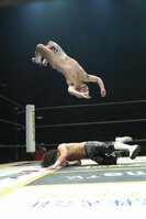 (限りなく全裸に近い状態となったディーノに、佐々木は「男色殺法の向こう側」としてガーターベルト姿で対抗。これがDDTビッグマッチのメインだ)