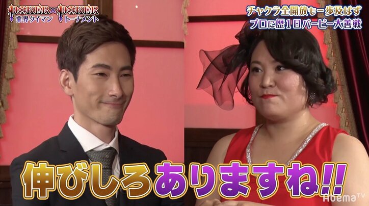 女芸人・バービーがポーカー歴“1日”でプロ相手に大善戦 「伸びしろありますね」と自画自賛 2019/03/15 09:37 拡大する 女芸人・バービーが10月26日、AbemaTV「GACKTプロデュース!POKER×POKER~業界タイマントーナメント」に出演。日本唯一の専属ポーカープロ・一ノ瀬公聖と対決し、予想外の大接戦を演じた。 試合前に「軽々優勝してしまう自分が怖い。才能があるんじゃないか」と語ったバービーは、実のところ、この日が初ポーカーの超素人。「ポーカーは運。今のヒキの強さだとプロでも大丈夫」と、10月トーナメント大会を制した自らの豪運に酔いしれている様子であったが、その豪運で本当にプロを苦しめてしまうのだから大したものだ。 続きを読む