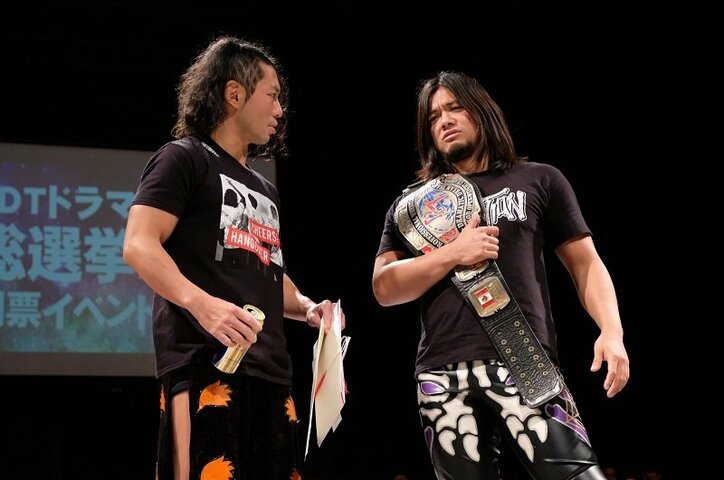 「ああいうヤツが一番腹立つ」「賞金100万円を試合に賭けろ」“カリスマ”佐々木大輔、DDT総選挙1位・高梨を張り手!早くも因縁勃発 2019/10/24 23:25 拡大する DDT恒例の「ドラマティック総選挙」開票イベントが、10月30日に新木場1st RINGで行なわれた。(DDTを支えてきた両者が後楽園のメインで激突する)個人部門1位に輝いたのは高梨将弘。ユニット部門でも所属する「酒呑童子」が1位となり、高梨は2冠達成だ。個人部門の中間発表では常に伊藤麻希に続いての2位だったが、最後に大逆転を果たした。“技巧派バイプレイヤー”的なイメージのある高梨だが、文字通りドラマティックな1位獲得だ。 続きを読む