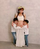 さらに、花かんむりをつけた白のワンピース姿で妊娠9ヶ月のお腹を大事に抱いたショットや、長男の青空くんと次男の昊空くんに挟まれたショットなども披露。