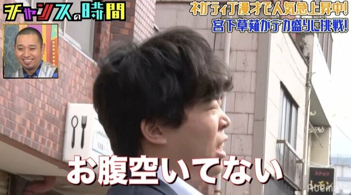 ネガティブ芸人のドン引き奇行連発に千鳥・大悟「地上波なら夜でも放送出来ない」 2019/03/15 09:37 拡大する ネガティブすぎるキャラクターで注目を集めているお笑いコンビ・宮下草薙が、11月14日放送の千鳥がMCを務めるAbemaTVのバラエティ「チャンスの時間」に出演した。先月放送回の食レポに続き、今回はデカ盛りメニューに挑戦したところ、またしても草薙航基がドン引き奇行を連発した。 ロケ開始から草薙は、「そもそも汚いヤツが飯食ってるのなんて誰も観ないよ」とネガティブキャラを発揮。相方・宮下兼史鷹が草薙を前向きにさせようと諭すと「うわっ! うわ! なんだこいつ!」と前回同様コンビゲンカが始まってしまった。そこはなんとか収まったものの、今度は「あんまりお腹減ってない」とわがままを言い出す草薙。挙げ句の果てには「行かないっ!」と思い切った決断をして、スタジオで見ていた千鳥らをドン引きさせた。 続きを読む
