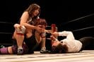 (キャメルクラッチにかかったまなせに、レフェリー今成はローアングルで「ギブアップ?」。凄まじい目の輝きだった)