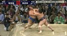 前頭九枚目の琴奨菊(佐渡ヶ嶽)が前頭十三枚目・阿武咲(阿武松)を強烈なガブリ寄りからの極め出しで、土俵の外に追いやって平成三十年五月場所以来三場所ぶりの勝ち越しを決めた。