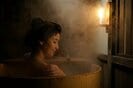 一人湯に浸かっていたおりょうは、窓の外に集結した捕り方を発見。すぐさま湯船を飛び出し、濡れた身体に袷を羽織っただけで裏階段を駆け上がる。部屋に飛び込みギョッとした表情で迎える龍馬と三吉に「槍を持った大勢の敵が来ました!」と急を知らせるおりょう。入浴シーンから両肩も露わに急を告げ、待ち構える捕り方の前を一人堂々と出て行く、“橋本おりょう”の姿をお見逃しなく。