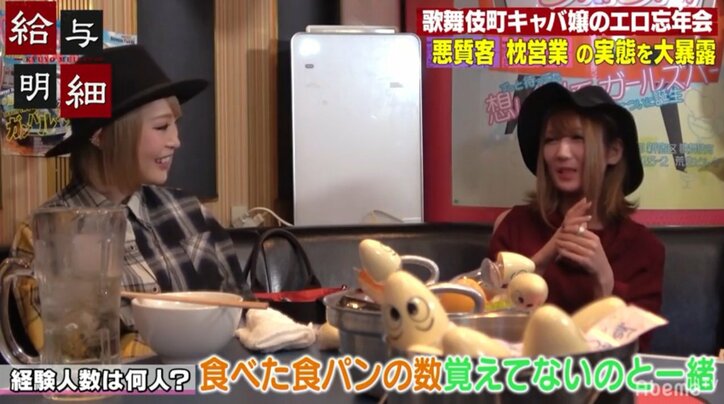 高級キャバ嬢が忘年会で性を語る!「男を食うのもパンを食うのも一緒」 2019/03/15 09:40 拡大する 「年収1000万円以上は普通に行く」という歌舞伎町の高級キャバ嬢5人の忘年会に、1月6日放送のAbemaTV「給与明細」が密着取材した。 居酒屋に入店早々、1本3万円のシャンパンを注文する5人の高級キャバ嬢たち。彼女たちいわく、3万円程度は「気軽に頼める金額」だそうだ。乾杯後、口から飛び出たのは男性客に対する愚痴の数々だった。おじさん客のほとんどが胸のサイズを聞いてくるそうで、1人のキャバ嬢は「こっちは毎日(胸を)盛っているんだわ。『Fカップです~』とか言っとけば信じるよね」と男性からすれば夢のないコメントをしていた。おじさん客は夜の営みに対する異常な自信を持っているという話題になると、「『お前のことイかせてあげる』とか言ってくるけど、お前じゃ乾く! 砂漠だわ!」とぶっちゃけた。 続きを読む
