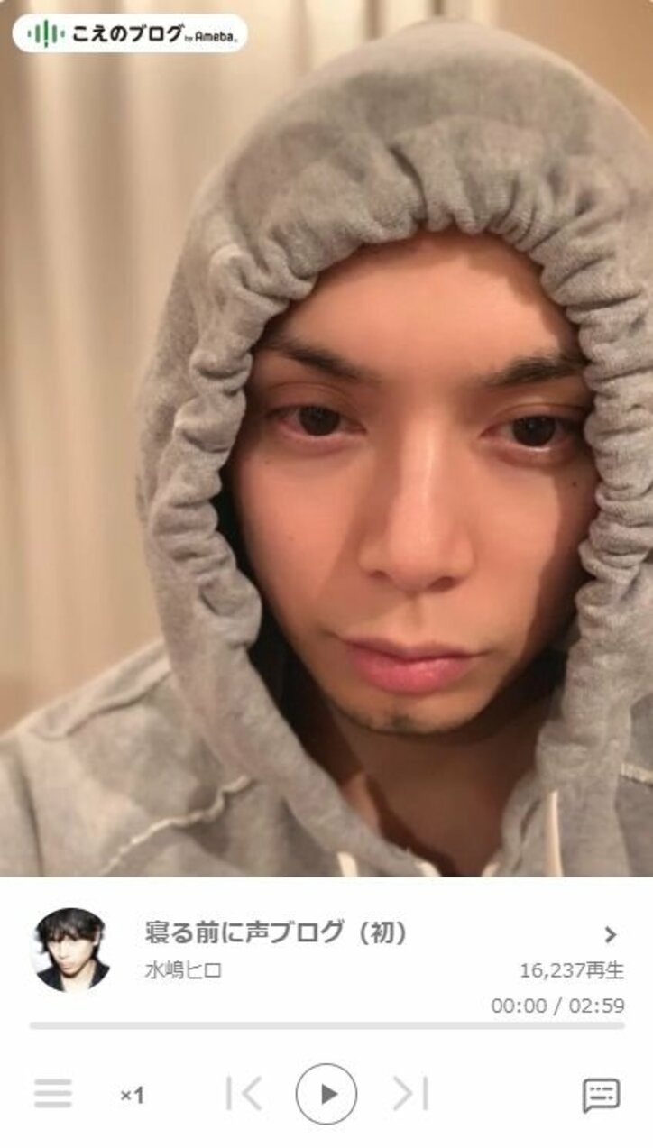 水嶋は「寝る前に声ブログ(初)」というタイトルでブログを更新。「声だけでブログ書けんだったらいいよねって思ってとりあえず試してみてる」と明かし、「何喋ろうっていう間がいっぱいできちゃうけど」「そんなのもありっていうことで許してもらえたら」と述べた。