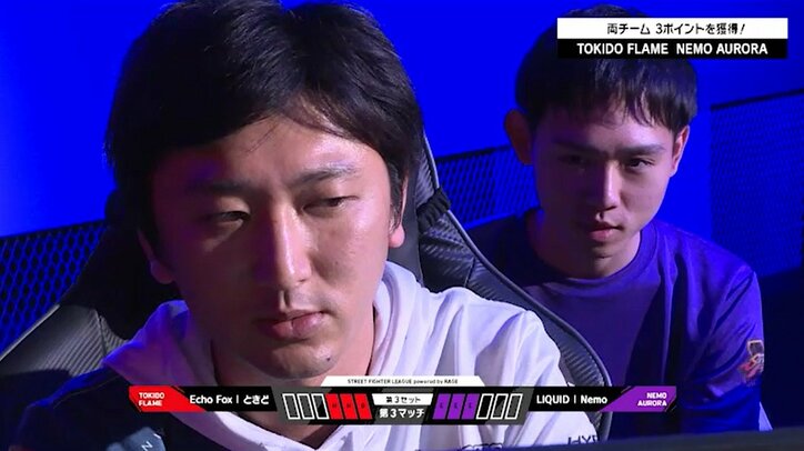 2月3日に放送された「ストリートファイターリーグ powered by RAGE」第2節トキドフレイムとネモオーロラが対戦。トキドフレイムがビギナークラスとハイクラスで勝利した絶対優位の状況で、ネモオーロラのリーダー、ネモ(使用キャラ:ユリアン)がときど(豪鬼)との激闘を制し3-3のドローに持ちこんだ。