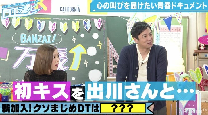 初キスは出川哲朗!プロ意識の低いおもしろ荘芸人に、チュート徳井ら非難轟々 2019/03/15 09:40 拡大する DT(童貞)にスポットを当てた青春バラエティ番組『DTテレビ』#63(毎週金曜23時~)が2月8日AbemaTV(アベマTV)にて放送。プロ意識の低い若手芸人DTにスタジオからブーイングが巻き起こった。 今回番組に初登場したのはクソまじめDT(芸人)かのう。かつて一流企業に勤務していたものの責任感が強すぎて頭が軽くハゲてしまったというクソまじめなDTだ。一見まともなかのうに、小首をかしげるスタジオの一同。しかし本人は「挙動が毎回おかしいと言われる」と語り、その辺りにDTたる所以があるのではないかと自己分析した。さらに「1度もキスとかしたことがなくて」と語るかのう。MC徳井が今までチャンスはなかったのかと尋ねると、人気バラエティ番組おもしろ荘に出演した際のことを振り返り「初キスを出川さんとすることになって…」と打ち明けた。 続きを読む