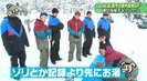 しかし龍友の記録地点を超えると倒れ込み、そりに仰向けになってカムバック。そり上の、無防備な哀れな涼太の姿に、ゲレンデの下にいるメンバーからは笑いが起きる。戻ってきた涼太は「自分との勝負だよ」と涼しげに発言、記録は56.6メートルだった。
