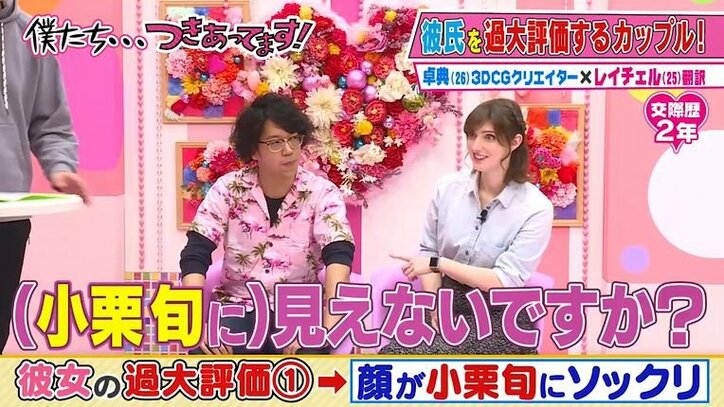 外国人美女「私の彼氏、小栗旬にソックリなんです」 カミナリたくみ「クソほど似てない」 2019/10/24 21:29 拡大する 2月12日、AbemaTV(アベマTV)のAbemaSPECIALチャンネルにて、『僕たち…つきあってます!』(毎週火曜よる0時~)#5が放送された。 この番組は、世間からちょっとズレた価値観を持つカップルからお悩みを聞き、解決できるものはしていくリアルな偏愛トークバラエティ。MCを務めるかまいたち・濱家隆一&山内健司、カミナリ・竹内まなぶ&石田たくみが、現代カップルの奇想天外なエピソードを聞き出していく。今回のゲストはモデル・タレントの池田美優(みちょぱ)だ。 続きを読む