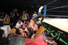 (佐々木の攻撃ぶりも遠慮なし。トペで頭から突っ込み、自分ごと竹下を場外のテーブルに叩き落とした)