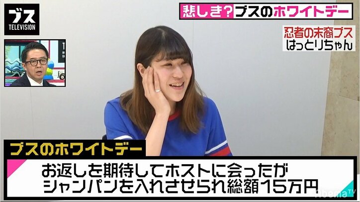 ホストにハマった女の悲惨なホワイトデー 「デートしよ」と誘われて… 2019/04/10 11:43 拡大する おぎやはぎの小木博明と矢作兼がMCを務めるトークバラエティ『おぎやはぎの「ブス」テレビ』#105(毎週月曜よる9時~)が3月11日、AbemaTVにて放送。「ホワイトデーの悲しい思い出」をテーマにトークを繰り広げる中で、ある“ブス”が明かしたホストとのエピソードがスタジオの涙を誘った。 “忍者の末裔ブス”こと芸人・はっとりちゃんは、「ホストにハマっていた時、ホストにチョコレートを渡し、シャンパンも開けた」と告白。ホワイトデーに「一緒に飲もうよ。デートしよ」とLINEが届いたので、お返しを期待してそのホストに会うことになったそうだ。 続きを読む