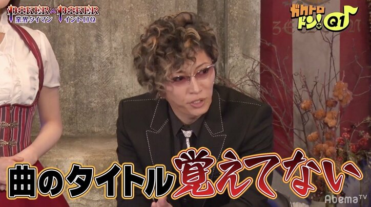 GACKTがファン公言の声優・逢田梨香子とのイントロクイズ「ガクトロドン」で大苦戦 「自分の曲のタイトルは覚えていない」 2019/04/10 11:43 拡大する ミュージシャンのGACKTが3月15日、自らがオーナーを務めるAbemaTV「GACKTプロデュース!POKER×POKER~業界タイマントーナメント」に出演。ファンを公言する声優・逢田梨香子と自身の曲でのイントロ早押しクイズで対決し、まさかの苦戦を強いられた。 きっかけは、週刊漫画誌に載っていたという逢田のプロフィールだった。「特技・GACKTのイントロクイズ」。ならば、本当かどうかテストをしようと、イントロ早押しクイズに発展した。逢田VSGACKT、見届け人は逢田とのポーカー対決で出演したお笑い芸人・野性爆弾のくっきーが担当した。本人の出場では、逢田に勝ち目はない。誰しもがそう考えたものの、GACKTは「そうでもない」「自分の曲のタイトルは覚えていない」と仰天発言。続けざまに「顔は覚えているけど女性の名前は覚えていないってこと、ありますよね?」と同意を求めた。これを聞いたくっきーが「乳のかたちで分かることはある」と発言。GACKTが「最低ですね…」と呟くも、「自分の曲のタイトルを覚えていないのも、たいがい最低ですよ」と一蹴されたところで、イントロ早押しクイズ「ガクトロドン」が始まった。 続きを読む