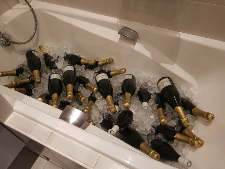 パリに住む友人達が準備をしてくれたといい、「きっとみんな飲むだろうなあ~~と沢山のシャンパンを用意しました。当然、冷蔵庫にははいらないので・・・バスタブに氷をたくさん入れて・・・」とバスタブに氷とシャンパンを入れた写真を公開した。