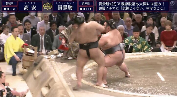 貴景勝、大関・高安を下して「二桁&大関ノルマ」に“王手”の9勝目 高安は痛恨の3敗目 2019/04/10 11:43 拡大する <大相撲大阪場所>◇十三日目◇22日◇エディオンアリーナ大阪 関脇・貴景勝(千賀ノ浦)が大関の高安(田子ノ浦)を押し出して9勝目を挙げた。 AbemaTVで解説を務めていた元前頭の大岩戸は「仕切り線を下がって踏み込もうとした高安でしたが、仕切り線に近い貴景勝の方が踏み込んでいました。立ち合いから勝負は決まっていました」と話した。(C)AbemaTV 続きを読む