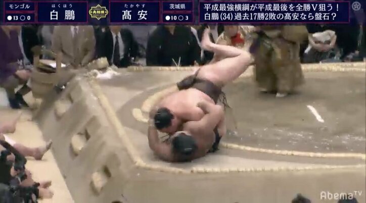 世代交代に“待った”34歳・白鵬、誕生月で42度目のVに王手 世代交代吹き飛ばす14連勝 2019/04/10 11:43 拡大する <大相撲大阪場所>◇十四日目◇23日◇エディオンアリーナ大阪 横綱・白鵬(宮城野)が、大関・高安(田子ノ浦)を浴びせ倒しで下し、初日からの14連勝で優勝に王手をかけた。前頭四枚目・逸ノ城(湊)が1敗を守ったことで、明日の千秋楽で横綱・鶴竜(井筒)に勝利すれば史上最多15度目の全勝優勝で、42度目の優勝が決まる。 緊張が走る一番は、立ち合いでの呼吸が合わず、両者が数秒間に渡り立った状態でにらみあう珍しい状況に。ようやく両者、腰を落として立ち合うと、張り差しからペースを握った白鵬は、両差しになり一気の寄り。最後は形にこだわらず、体ごと浴びせて高安を下した。 続きを読む