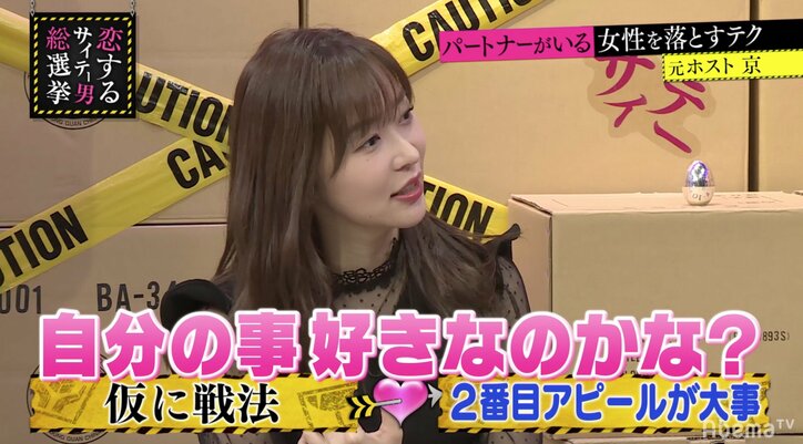 指原も思わず納得!元ホストが使う“恋人のいる女性を落とすテク” 指原莉乃&ブラマヨの恋するサイテー男総選挙 2019/04/10 11:43 拡大する HKT48の指原莉乃と、お笑いコンビブラックマヨネーズの小杉竜一、吉田敬がMCを務める『指原莉乃&ブラマヨの恋するサイテー男総選挙』#94(毎週火曜よる9時~)が3月26日、AbemaTV(アベマTV)にて放送。元ホストが語る『パートナーがいる女性を落とすテク』が話題を呼んでいる。 同番組は女性が幸せな恋愛をするために、ゆがんだ恋愛観を持つサイテー男たちから極悪非道なエピソードを聞き出して教訓にしていくトークバラエティ番組。 続きを読む