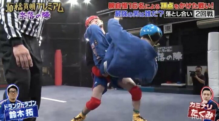 「全国の身長の小さい子供たちに勇気を与える」カミナリ・たくみがドランクドラゴン・鈴木拓相手に番狂わせ 2019/04/10 11:43 拡大する 身長159センチ、体重50キロ。小柄な男、お笑い芸人のカミナリ・たくみが熱い想いを胸に3月24日、AbemaTV「【石橋貴明プレミアム第2弾】芸能界頂上決戦!貴ヶ原の戦い!」に出演。芸能界最強の男を決める「落とし合い決戦・奈落の陣」に挑んだ。 「なんでこの大会に出たか、教えてやっか。全国の身長の小さい子供たちに勇気を与えるためなんだよ」。初戦、サンシャイン池崎との試合前に茨城訛りのラップで想いを爆発。会場を盛り上げると、得意のバスケットボールで鍛えたステップで池崎を翻弄し、床に突き落とした。 続きを読む