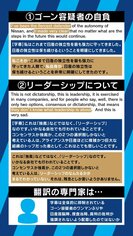 また、動画には日本語の字幕があるものとないものの2パターンが存在するが、例えば「I’ve been the fiercest defender」(私こそがこれまでの日産の独立性を最も強力に守ってきた)というような強いニュアンスが日本語字幕版では柔らかい表現にされていた。また、リーダーシップについて“「They don’t know what leadership is about」(リーダーシップの何たるかがまるで分かっていない)という表現は字幕が無いため、英語が分かる人とそうでない人では、映像で受ける印象がかなり違うというのだ。