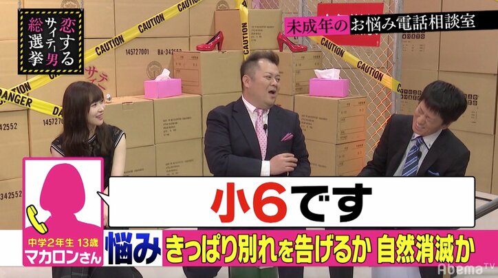 小6でファーストキス…ブラマヨ小杉、中2女子の恋愛相談に娘の面影を重ね「つらい」 2019/10/25 06:06 拡大する HKT48の指原莉乃と、お笑いコンビブラックマヨネーズの小杉竜一、吉田敬がMCを務める『指原莉乃&ブラマヨの恋するサイテー男総選挙』#98(毎週火曜よる9時~)が4月23日、AbemaTV(アベマTV)にて放送。同番組は女性が幸せな恋愛をするために、ゆがんだ恋愛観を持つサイテー男たちから極悪非道なエピソードを聞き出して教訓にしていくトークバラエティ番組だ。 今回『未成年のお悩み電話相談室』のコーナーでは、サイテー男たちが未成年のもんもんとした悩みを解決。電話相談室には13歳の中学2年生・マカロンさんから相談が入った。番組内容にそぐわない年齢層からの相談に、驚くスタジオの面々。吉田が「何で(この番組を)知ったの?」「誰が好き?」と尋ねると「お母さんが教えてくれました」「指原さんが好きです」と答えるマカロンさん。指原は「そういうことか。私こういう番組出るのヤメようかな。ごめんね」と、申し訳なさそうに謝罪した。 続きを読む