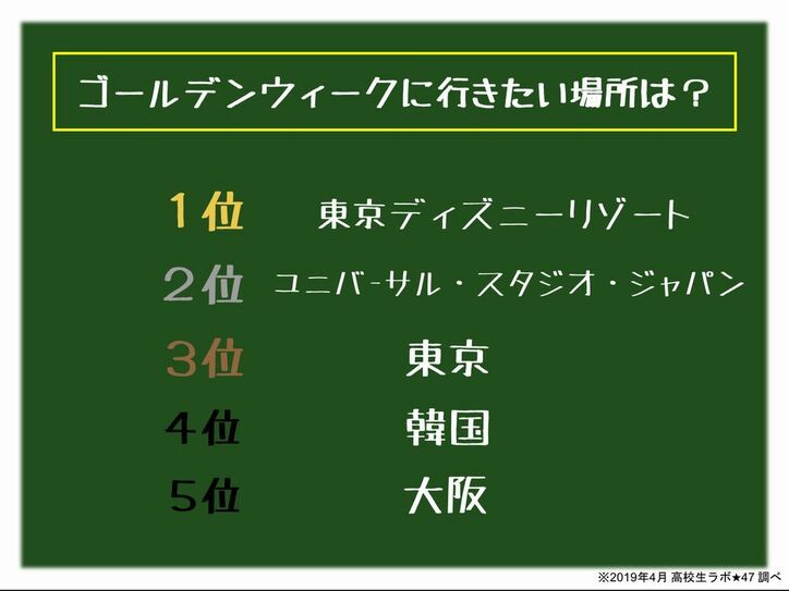 混雑なんて関係ない!? 高校生が選ぶゴールデンウィークに行きたい場所第1位は? 2019/10/24 08:08 拡大する 日本全国47都道府県の女子高生・男子高生ネットワーク「高校生ラボ★47」を運営する株式会社エイチジェイは、日本全国の現役高校生高校生670人を対象に、今年のゴールデンウィークに関するアンケートを行った。 今年のゴールデンウィークはなんと10連休ということで、現役高校生がゴールデンウィークに出かけたい場所を調査。 1位に輝いたのは不動の人気「東京ディズニーリゾート」続いて2位は「ユニバーサル・スタジオ・ジャパン」という結果に。高校生ならではの制服や、お揃いのコーディネート、普段街中では着れないような少し派手な服を着て「ディズニーリゾート」や「ユニバーサル・スタジオ・ジャパン」に行くことがステータスなようで、フォトジェニックなパーク内で写真を撮りSNSにアップするのも人気となっている。 続きを読む