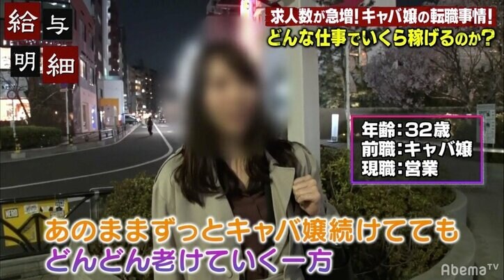 「あのまま続けても老けていく一方」キャバ嬢たちのセカンドキャリアに迫る 2019/10/24 12:12 拡大する 華やかな夜の世界に生きるキャバクラ嬢だが、平均的な引退年齢は30歳と、ある程度の年齢で区切りを付けて転職する女性も少なくない。4月28日に放送されたAbemaTV「給与明細」では、引退後のキャバクラ嬢のセカンドキャリアに迫った。 30歳を過ぎると引退を考え始めることが多いというキャバクラ嬢。夜の世界からの転職を手がける「昼ジョブ」の担当者は、「1都3県だけで毎月200件近く問い合わせと会員登録が来ている」と転職を希望するキャバクラ嬢が増加していると明かし、その理由について「お客さんの足数が減ったり、夜でも稼げない子が増えてきている。『だったら昼間の仕事で安定してやった方がいい』という声は多いですね」と解説した。 続きを読む