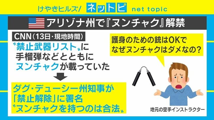 念願の解禁? 米アリゾナで「ヌンチャク」の所持が合法に 2019/10/24 11:11 拡大する アメリカ・アリゾナ州であるモノが解禁された。 CNNによると、「禁止武器リスト」に手榴弾などとともに「ヌンチャク」が載っているが、ダグ・デューシー州知事が現地時間13日に禁止解除に署名。ヌンチャクを持つことが合法となったという。 これまでにも地元の空手インストラクターなどからは「護身のための銃はOKで、なぜヌンチャクはダメなのか?」という声もあったというが、そもそもなぜ禁止だったのか。理由は1970年代、ブルース・リーに代表される「カンフー映画」が大流行したためで、映画に登場したヌンチャクが武器リストに追加された。 続きを読む