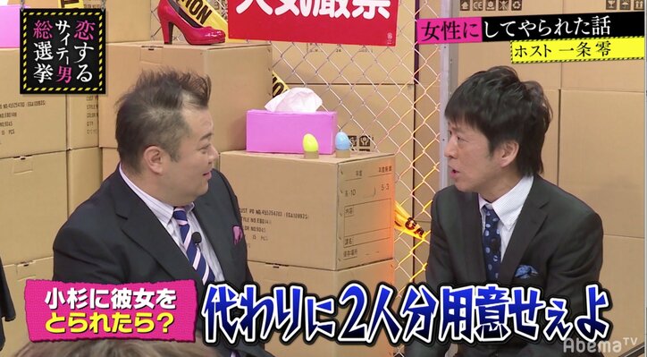 ブラマヨ吉田、もしも小杉に彼女を取られたら? 怖すぎる回答に小杉ドン引き 2019/05/29 08:08 拡大する 指原莉乃と、お笑いコンビブラックマヨネーズの小杉竜一、吉田敬がMCを務める『指原莉乃&ブラマヨの恋するサイテー男総選挙』#102(毎週火曜よる9時~)が5月28日、AbemaTV(アベマTV)にて放送。同番組は女性が幸せな恋愛をするために、ゆがんだ恋愛観を持つサイテー男たちから極悪非道なエピソードを聞き出して教訓にしていくトークバラエティ番組だ。 今回は『サイテー男も痛い目みてますSP』として、『女性にしてやられた話』がトークテーマに。ホストの一条零が語ったのは、ホストになる前から同棲していた彼女について。その彼女はとても良い彼女で、ホストになる前から一条のことを優しく支えてくれていて、一条がホストになって忙しくなると「(一条の)同期とアフター行くから他のお客さん優先して」と一条を気遣ってくれていたという。しかし、彼女と仲良くしていた同期はお店を飛んでしまい、彼女も行方知れずに。忙しかった一条は気に留める余裕がなかったが、1年後たまたま大阪のミナミで同期にばったり再会。すると、なんと同期とその彼女は出来ちゃった結婚していたという。 続きを読む