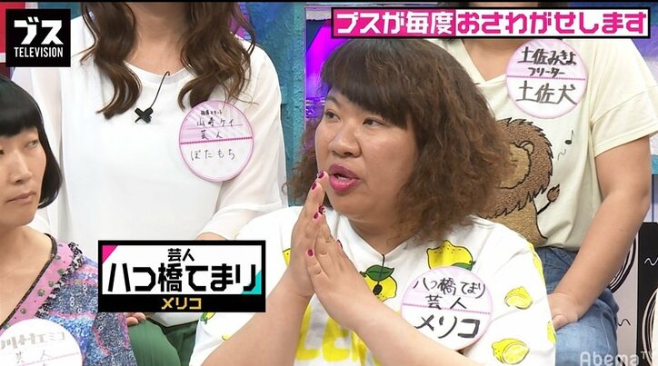 八つ橋が実際にスタジオを歩いてみると、確かに「サッサッサッ」と人が足を運ぶような音が響き、他の“ブス”メンバーからも「あー!」と納得の声が。“デブス代表”芸人・かなでは、「ありますあります」と大きくうなずき、八つ橋と“太めな人あるある”で意気投合していた。