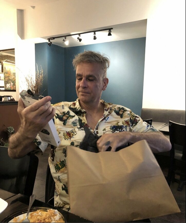 続けて「私から、ぶーぼー父さんにパンツ(下着の方。笑)のプレゼントです。ボブの好きなアーティストの一人、バスキアの絵が描いてあるパンツ。笑 いくらバスキア好きだからって、その絵が全面のボクサーブリーフはどうなの。笑」とプレゼントされたパンツを受け取っている夫の写真を公開。