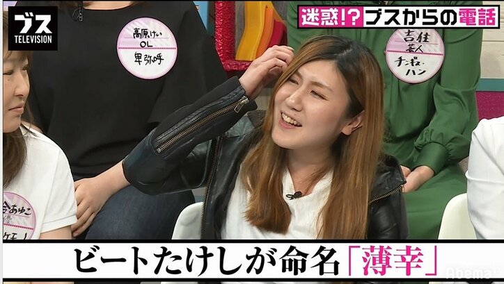 ビートたけしに名付けられた女芸人・薄幸(ススキミユキ)、ほか候補は「ビーチクロイクー」 2019/06/25 18:00 拡大する おぎやはぎの小木博明と矢作兼がMCを務めるトークバラエティ『おぎやはぎの「ブス」テレビ』#117(毎週月曜よる9時~)が6月24日、AbemaTVにて放送。“やさぐれたブス”として当番組に度々出演している小泉みゆきが、芸名の名付け親であるビートたけしとのエピソードを明かした。 小泉の本当の芸名は「薄幸(ススキミユキ)」で、これはあのビートたけしが付けた芸名とのこと。小泉のやさぐれた語り口や態度を見て、矢作は「たけし映画、出たことないの?」と質問。小泉が「あるわけないじゃないですか」と否定すると、小木と矢作は「出そうだよ」「出ていてもおかしくない」「そういう映画に合う」と、ビートたけしに好かれそうな小泉のキャラクターを認めた。矢作から「もしかしたら、そろそろオファー来るかもしれない」と言われると、小泉は「嬉しいですね~!」とコメントしながら、ふてぶてしく座り直した。 続きを読む
