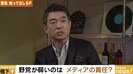 橋下:僕の責任もありますよ。ただ、田原さんが総理をガンガン追及して失脚させていた頃というのは自民党が"万年与党"で、また新しい総理が自民党の中から出てくる時代だった。それが今は野党を強くしないといけない時代。それなのに、政治評論家と言われる人たちは誰と誰が飯を食ったとか、あの自民党の重鎮がこんなことを話していたとか、そんなんばっかり。田崎史郎、鈴木哲夫、伊藤惇夫、あのグループ(笑)。そういう、しょうもない噂話じゃなくて、内政から外交まで、国民が求めている方向性を伝えるのがメディアの役割。もっと頑張ってよと思う。やっぱり野党って、そういう政治批評を見ながら、どっちの方向に行ったら支持率が上がるだろうと考える。でも、今の政治批評は与党を責めるばかりで、野党がどういう価値観を持つべきなのかというアドバイスがない。だから与党も緊張感がない。