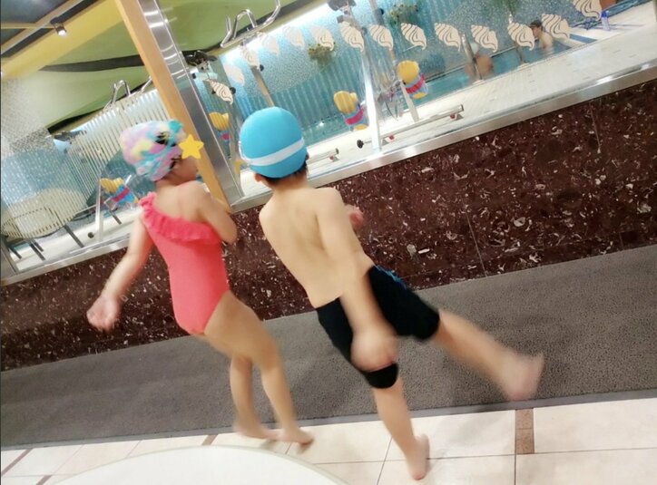 この日、「双子、今日からスイミングの習い事を始めました」と切り出すと、「娘は英語教室行っているから、次男にとっては初の習い事」と報告し、水着姿の子ども達の写真を公開。