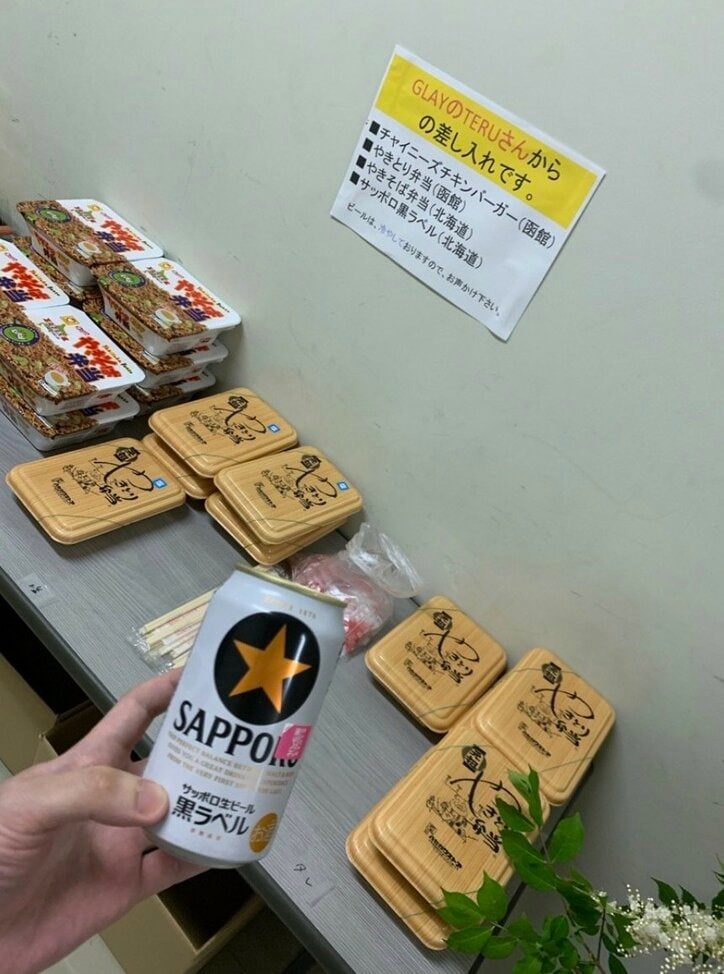 続けて鬼龍院は、「会場入り前にラッキーピエロ北斗飯生店へ寄らせて頂きました」「テイクアウトして、せっかくなので道南いさりび鉄道乗って会場へ行ったよ」と現地での様子を写真で公開。続けて「会場にはGLAYのTERUさんから豪華な差し入れが…!」と弁当やビールの差し入れがあったことを写真で公開し、「ありがとうございます!函館公演に続き北斗公演まで」と感謝を述べた。