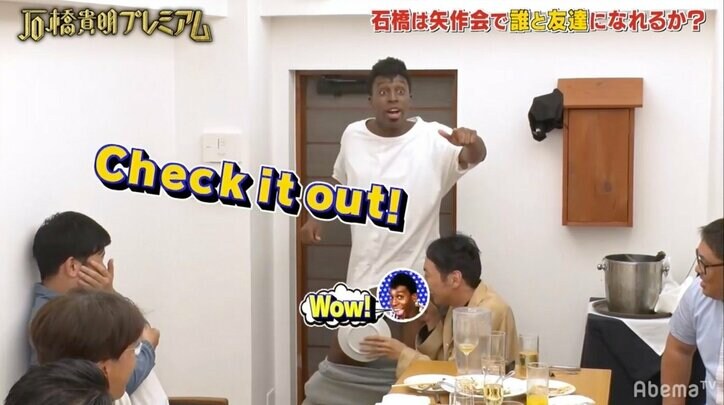 「ザキヤマが来るぅ~」。山崎のお馴染みネタ以外、失笑しかしない石橋。誰もが苦戦して微妙な空気が流れ始めた中、元ゴールドマンサックスのエリート芸人・アイクぬわらがやってのけた。得意の持ちネタを披露。股間を指で叩いて、「Oh Yeah!」「Check it out!」とリズミカルに発するだけのものだが、これに石橋は大ウケ。その後は誰かがスベるとこれが発動する展開になり、その都度、石橋は手を叩いて喜んだ。結果、石橋はアイクぬわらとLINE交換。その後の生放送にも、アイクぬわらと共に出演し続けた。