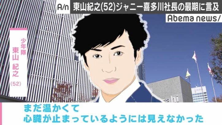 東山紀之、ジャニー喜多川さんの最期の様子について明かす「まだ温かくて」 2019/07/15 14:38 拡大する 少年隊の東山紀之が14日、テレビ朝日系の情報番組「サンデーLIVE!!」に生出演し、9日に亡くなったジャニーズ事務所社長、ジャニー喜多川さんへの思いを語った。 ジャニー社長は、とにかく優しかったと語った東山。最期の様子について「亡くなった時、3分から5分くらい遅れて行ったのですが、すでにマッチ(近藤真彦)さん、滝沢(秀明さん)も号泣していたので『間に合わなかったな』と思って…。間に合わなくて、本当にごめんなさいみたいな気持ちが大きかった」と振り返った。 続きを読む