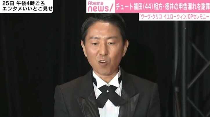 チュート福田、徳井にかわって謝罪「本当にすいませんでした」深々頭を下げる「本人もすごく反省しておりました」 2019/10/26 07:48 拡大する お笑いコンビ・チュートリアルの福田充徳(44)が10月25日、東京・六本木のナイトクラブで行われた高級シャンパン「ヴーヴ・クリコ」のPRイベントに出席した。相方の徳井義実(44)が東京国税局から1億円を超える申告漏れ・所得隠しを指摘されていた問題について、福田は「この度は相方の徳井がみなさまに大変ご迷惑、そして不快な思いをさせてしまい、本当にすいませんでした」と謝罪した。 イベントではモデルのマギー(27)をエスコートする執事役として登場。もともとあまり縁がなかったハロウィンについて、今年は子どもと楽しむことを決めた話など、笑顔も見せていた。それでも終了直後に報道陣から、徳井についての質問が飛ぶと背筋を伸ばし「本当にすいませんでした」と、深々と頭を下げた。 続きを読む